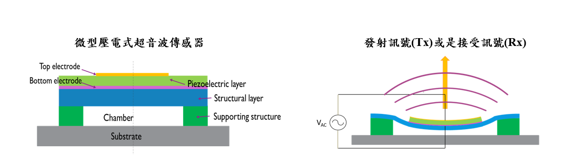微型壓電式超音波傳感器(PMUT)是微機電系統裡一種新型的傳感器。有別於傳統塊材式壓電傳感器,PMUT利用壓電薄膜,耦合於一可震動的結構上,當外加電訊號,元件便會開始產生震動,進而發射超音波,若是外加超音波,則元件便會將其轉換成電訊號。在元件結構中,傳感器的響應頻率決定於結構層厚度而非壓電材料本身之厚度,故帶來更大的設計彈性。雖然目前PMUT的輸出功率仍小於傳統壓電傳感器,但其具有在結構設計上更大的彈性、水中良好的阻抗匹配性與低輸入電壓等優勢,故在未來極有可能成為新一代的超音波傳感器元件。