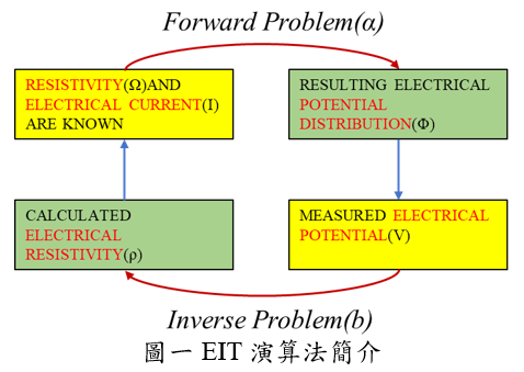 EIT電阻抗成像(Electrical Impedance Tomography, EIT)是一種非侵入式(noninvasive)重建人體內部組織影像之技術,可即時顯示人體內部組織之影像。如圖一所示,藉由已知注入電流(I)、預設阻抗分布狀況(Ω),透過解Forward Problem(α) 得到電壓分布情況(Φ), 並與電極量測到之電壓(V)比較後,經過解Inverse Problem(b)反推得阻抗分布情形(ρ),並重複此流程直至電壓分布與測得之電壓差距最小。