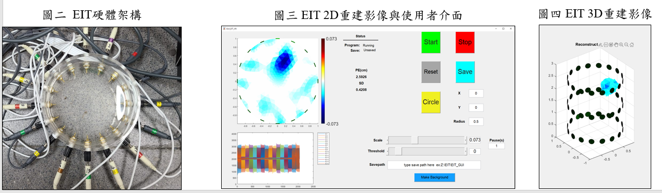 本實驗室透過Matlab與Python的搭配,整合硬體與2D、3D影像重建演算法以及使用者介面(GUI)(圖二、三、四),實現穿戴式EIT系統軟體架構部分,未來將以此方面繼續延伸下去。