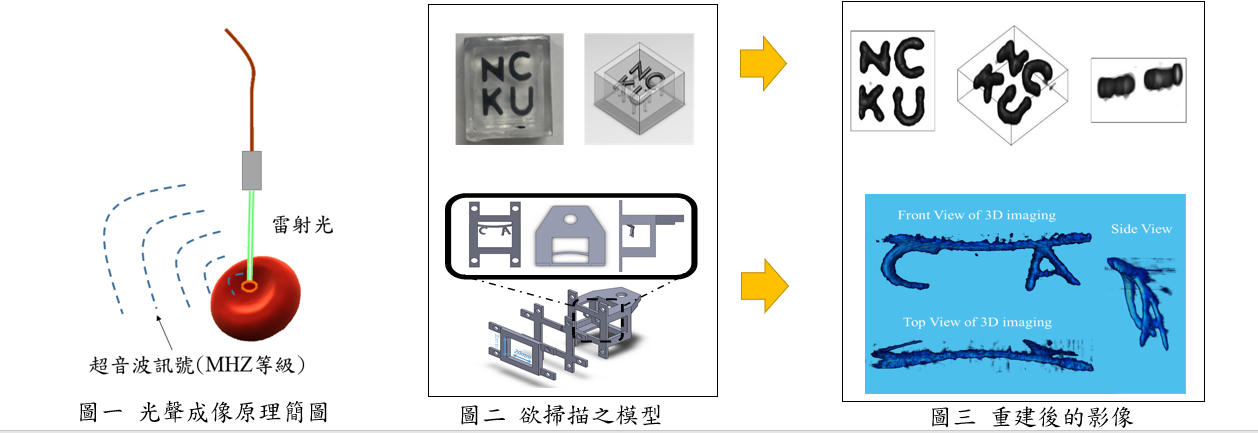 光聲影像技術(Photoacoustic image, PAI)是一種非侵入式的成像方法,目前已被廣泛應用於生物醫學影像中,其原理為利用雷射光源激發組織進而產生超音波。如圖一所示,首先,使用脈衝雷射光照射成像部位,一部份的光被組織吸收後轉換成熱能,並產生彈性膨脹,發射寬帶(MHz等級)超音波,接著,透過自行開發的透明可撓式超聲接收器將聲波訊號轉換成電壓,再將收集到的訊號利用程式重建,即可轉換為影像。圖二為欲掃描之模型,接收器接收到的超音波經訊號處理後重建的影像如圖三所示,可以明顯的看出影像與掃描的模型,在各種角度的成像都相符。